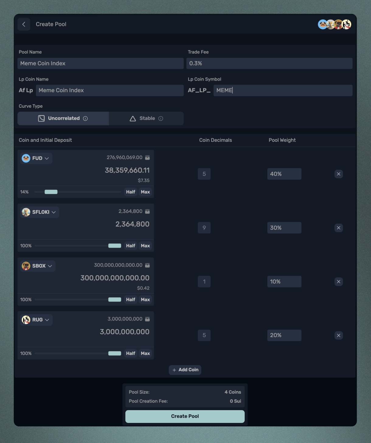 创建资金池完全不需要权限,也不收取任何费用。您可以在任意权重下创建多达 8 种资产,因此在创建新池时可以尽情发挥创意!