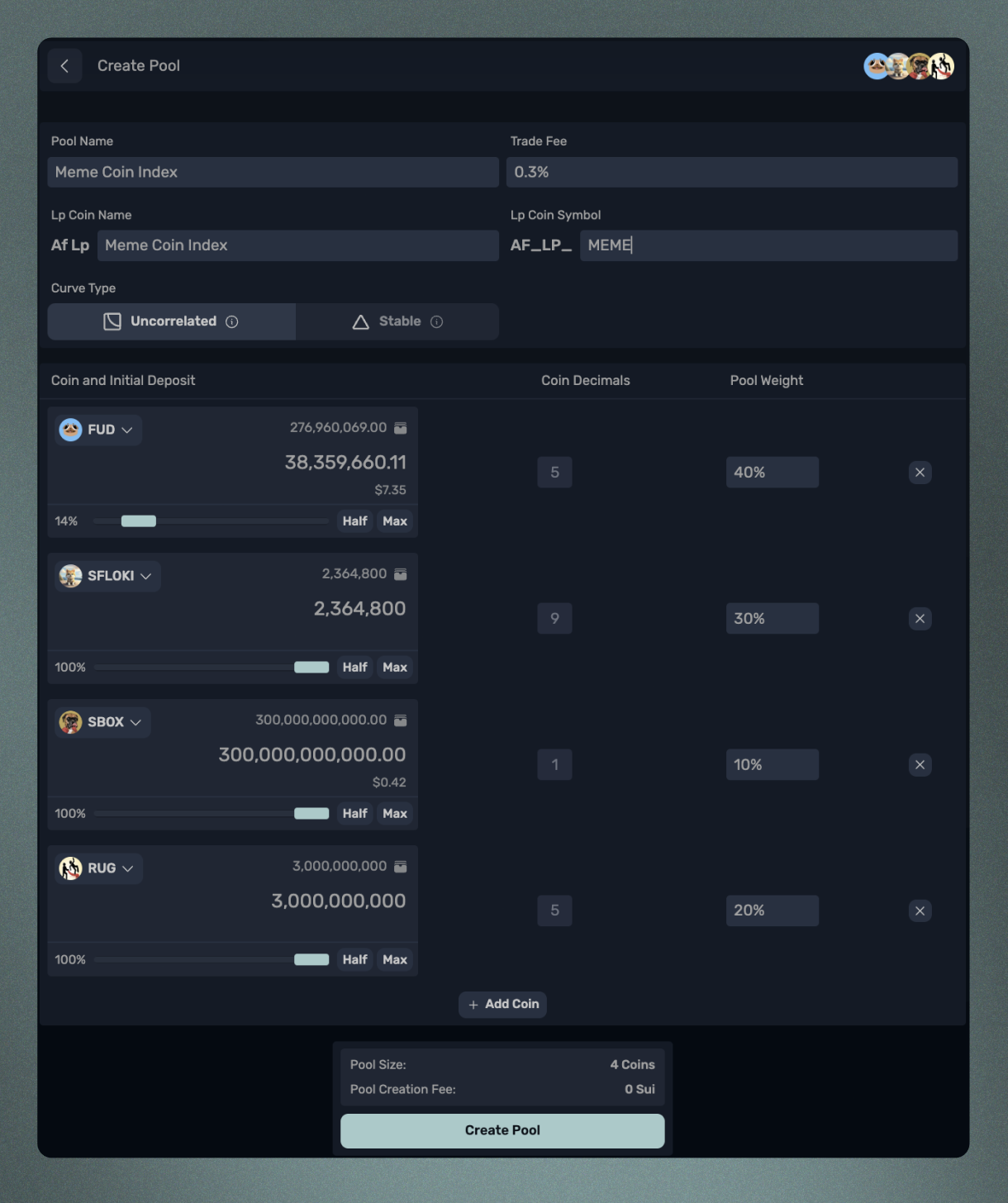 创建资金池完全不需要权限，也不收取任何费用。您可以在任意权重下创建多达 8 种资产，因此在创建新池时可以尽情发挥创意！