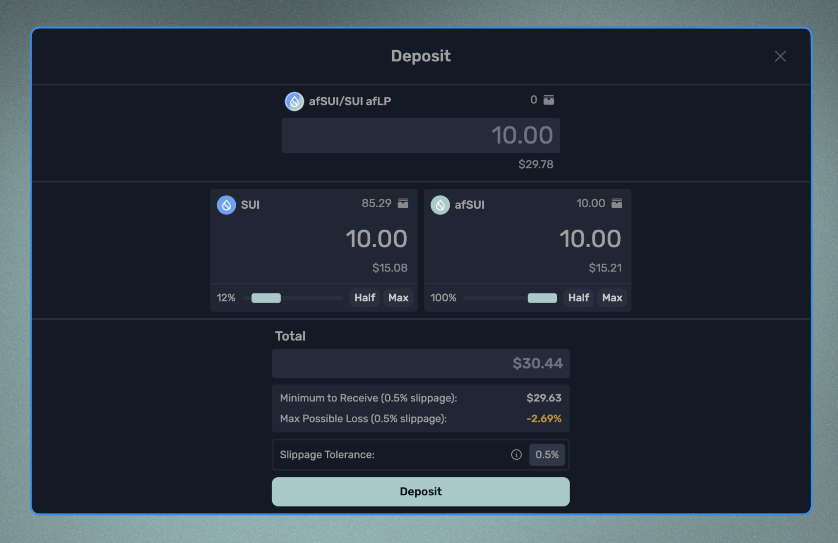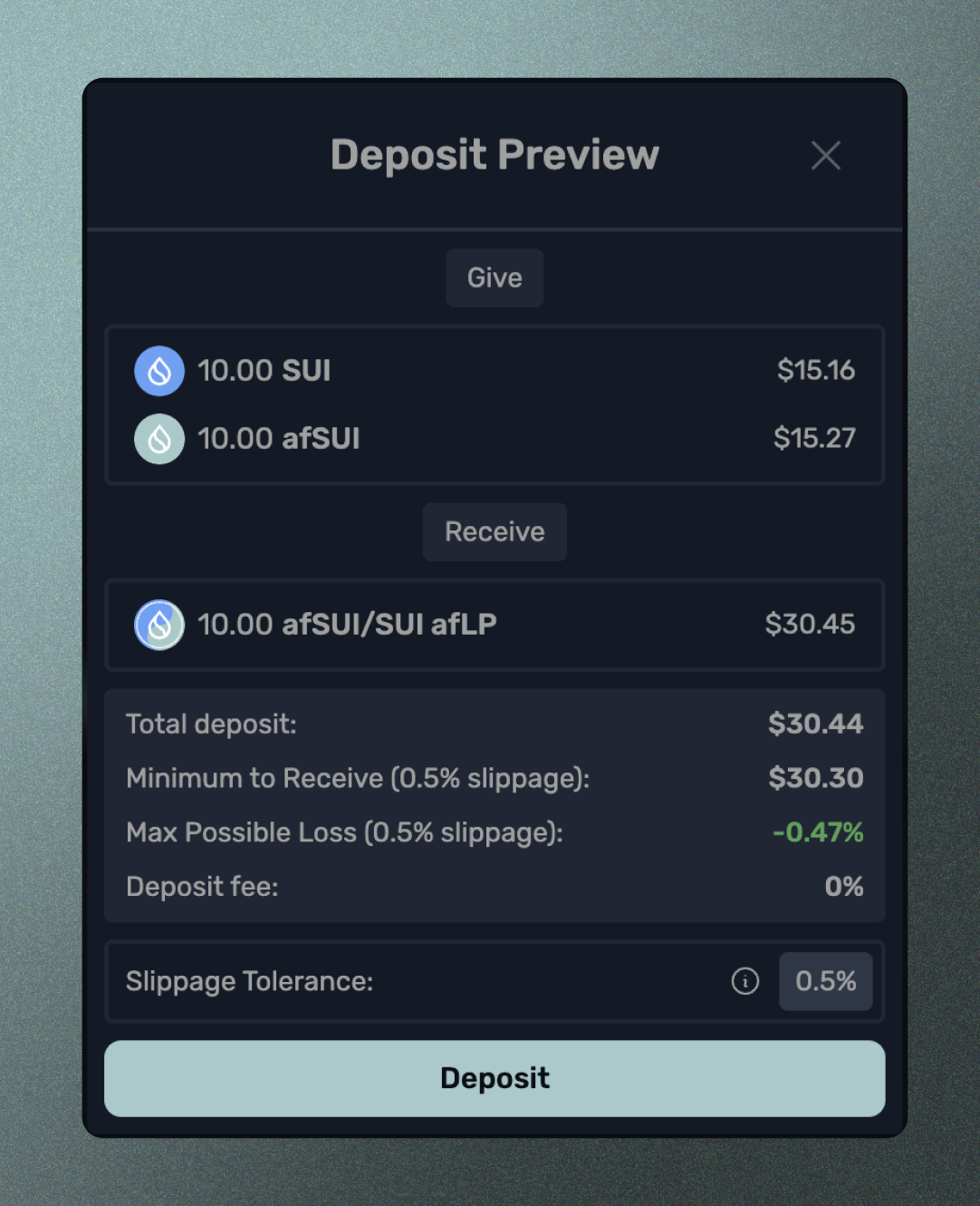 在这里，您可以查看您的存款，以确保您将收到的 LP 代币的价值，并设置您允许的最大滑点。滑点指的是向代币池存入代币所产生的价格影响，相对于代币池中的总流动性而言，当存入大量代币时，滑点影响最为显著。例如，在上图中，存入的代币总价值为 30.44 美元，而将收到的 LP 代币价值为 30.45 美元。指定的 0.5% 滑动容差可确保至少收到价值 30.30 美元的 LP 代币，否则存款将退回，无法完成。