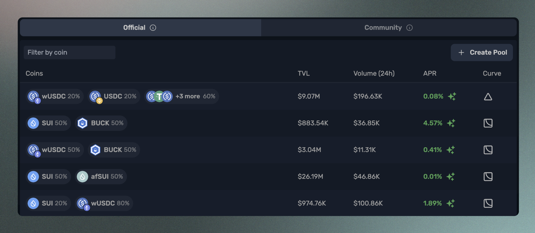 官方池是由 Aftermath 与合作伙伴共同创建的池。社区池是完全无权限的，任何人都可以创建。我们采取这种方式是为了确保最佳的用户体验，同时也尊重去中心化。