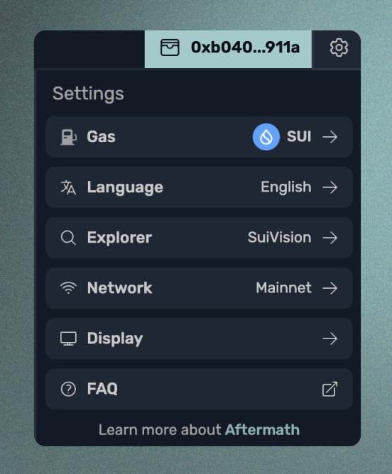 在屏幕顶部菜单栏的最右侧,您会找到一个齿轮图标。 点击这个图标可以让您自定义查看和与Aftermath Finance dApp 互动的方式。