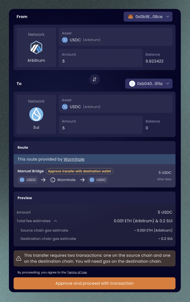 一旦您输入了币种和桥接数量,并查看了预估费用,请点击“Approve and proceed with transaction”。然后,您将被提示在您的钱包中批准交易。一旦批准,您可以监控桥接转账的进展。