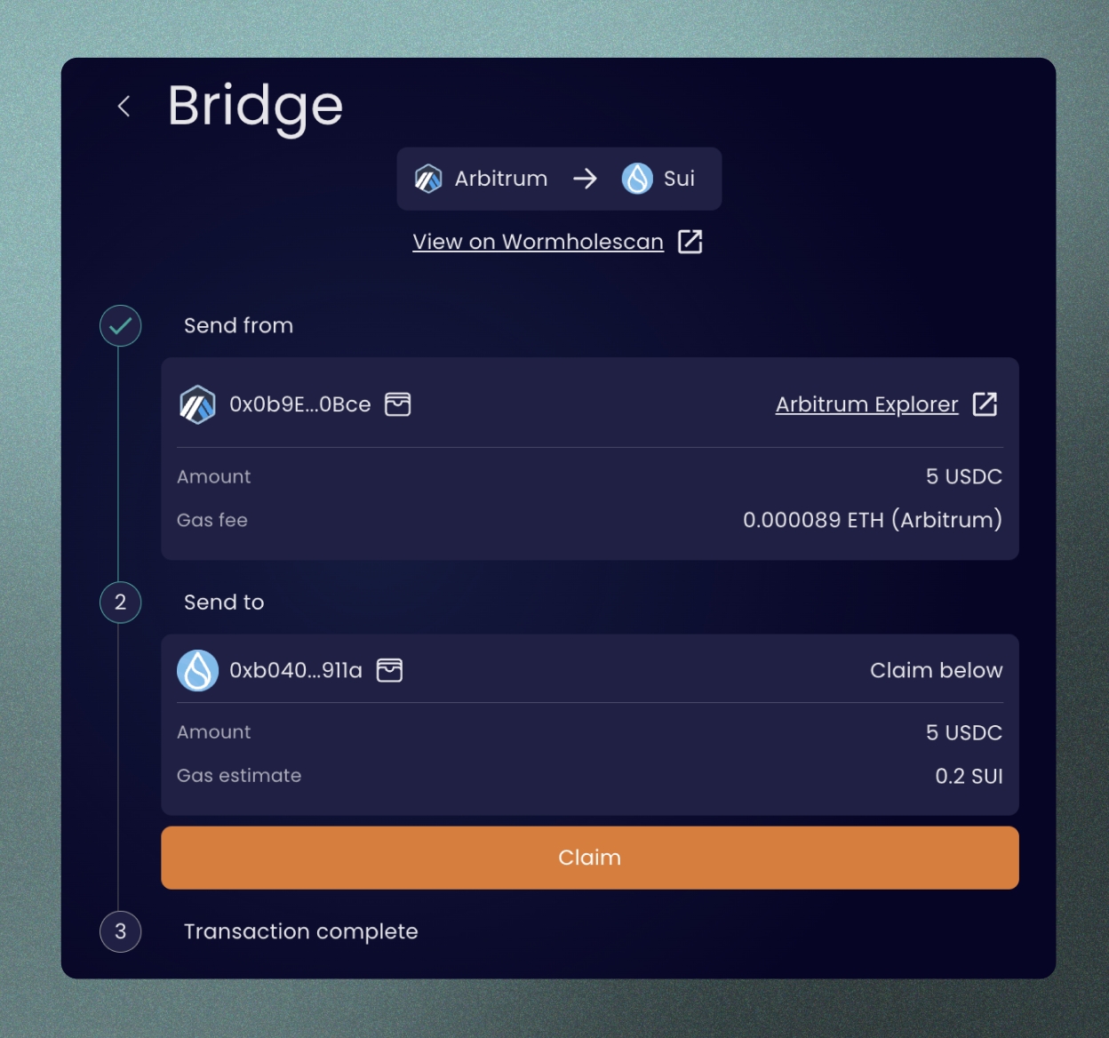 单击“Bridge Using Wormhole”按钮启动门户桥dApp。选择 Sui 作为您的目标链,并选择要从中进行桥接的链。接下来,您需要连接您的 Sui 钱包以及您在正在进行桥接的链上使用的钱包(例如 Metamask)。