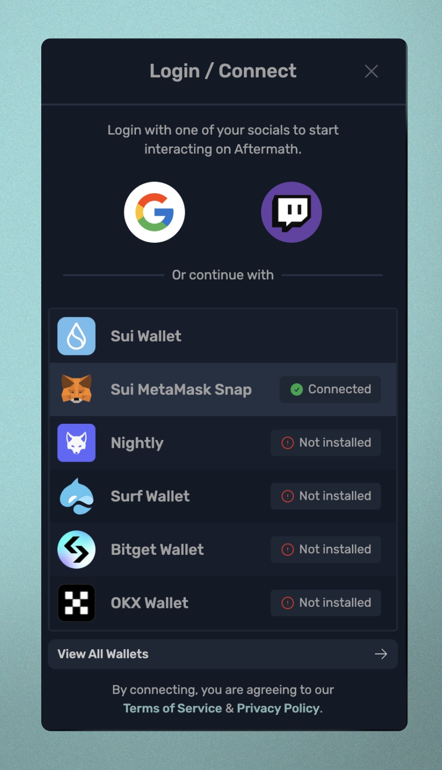 钱包连接界面将显示一个可以与Aftermath一起使用的钱包列表。点击任何标记为“未安装”的钱包,将会链接到官方网店,在那里您可以将扩展程序安装到您的浏览器中。