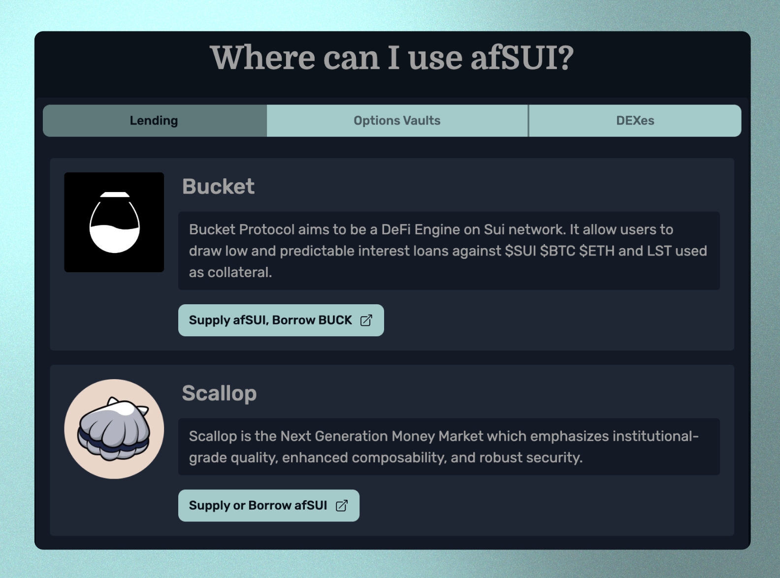 afSUI 已被整合到 Aftermath 在 Sui 上的多个合作伙伴协议中。你可以在质押页面底部的 "我在哪里可以使用afSUI?