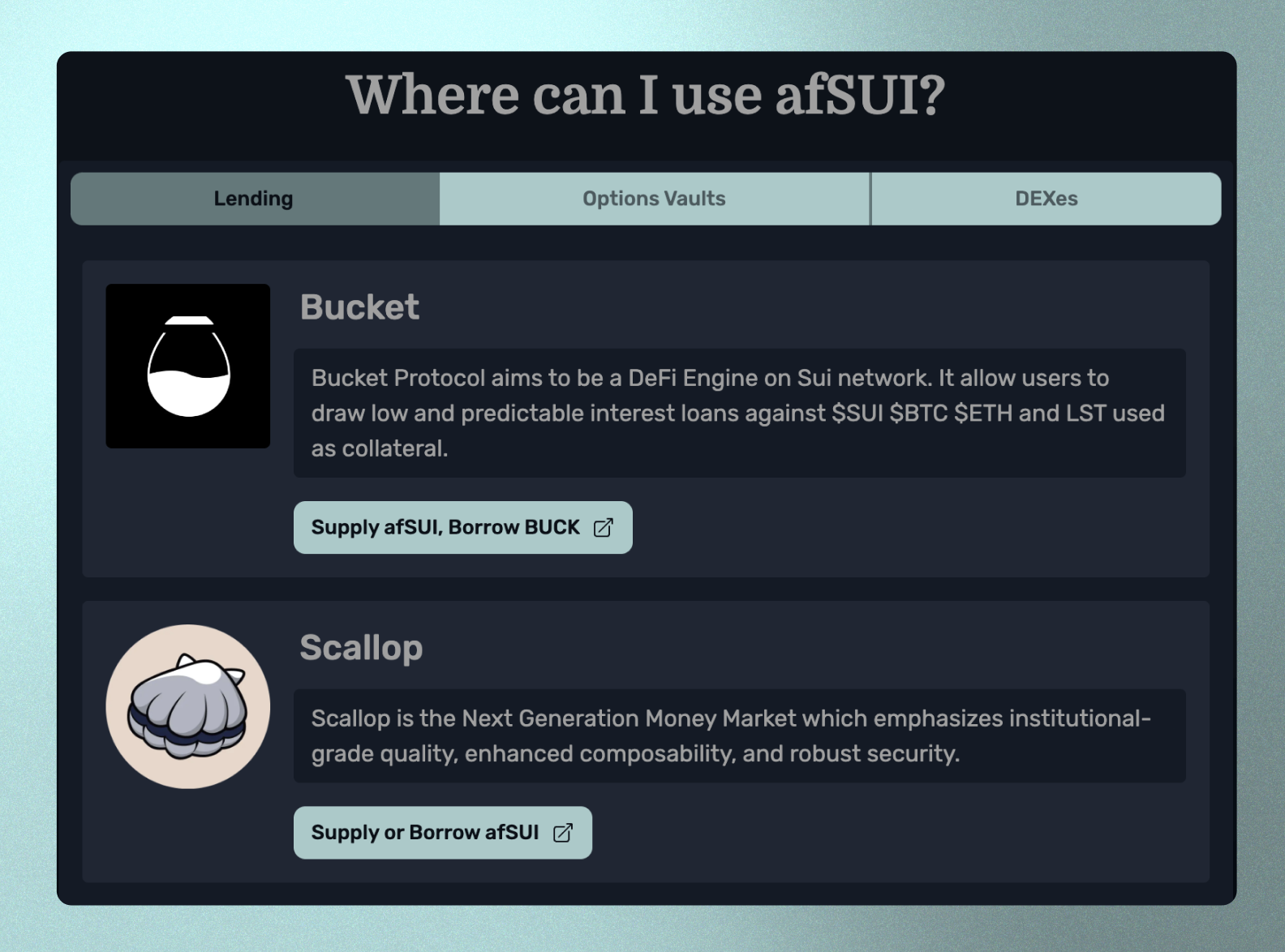### 我可以在哪里使用 afSUI？ <a href="#wo-ke-yi-zai-na-li-shi-yong-afsui" id="wo-ke-yi-zai-na-li-shi-yong-afsui"></a>