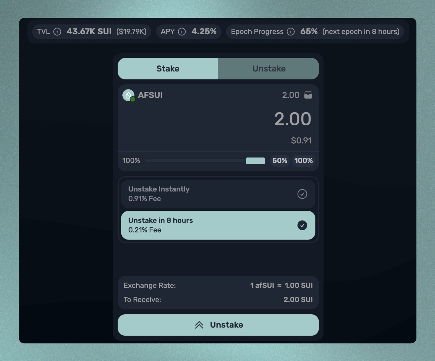 每种解除质押类型的费用都会显示出来,让用户决定是等待时代推进还是立即收取他们的SUI代币。一旦您决定使用哪种解除质押方法,请输入您想赎回的afSUI数量并点击“解除质押”。
