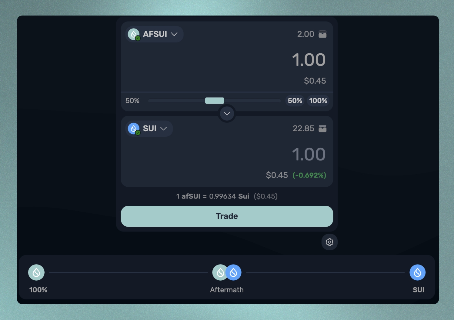 有第三种方法可以兑换 afSUI 为 SUI,即使用我们的智能订单路由器进行交换。事后和其他几个去中心化交易所维护 afSUI-SUI 流动性池,以便进行这些交易。根据流动性池和事后即时解锁储备的库存情况,可能更倾向于利用这种方法。转到我们的交易页面,并选择 afSUI 作为要交换的资产,选择 SUI 作为要接收的资产,以查看当前的汇率。