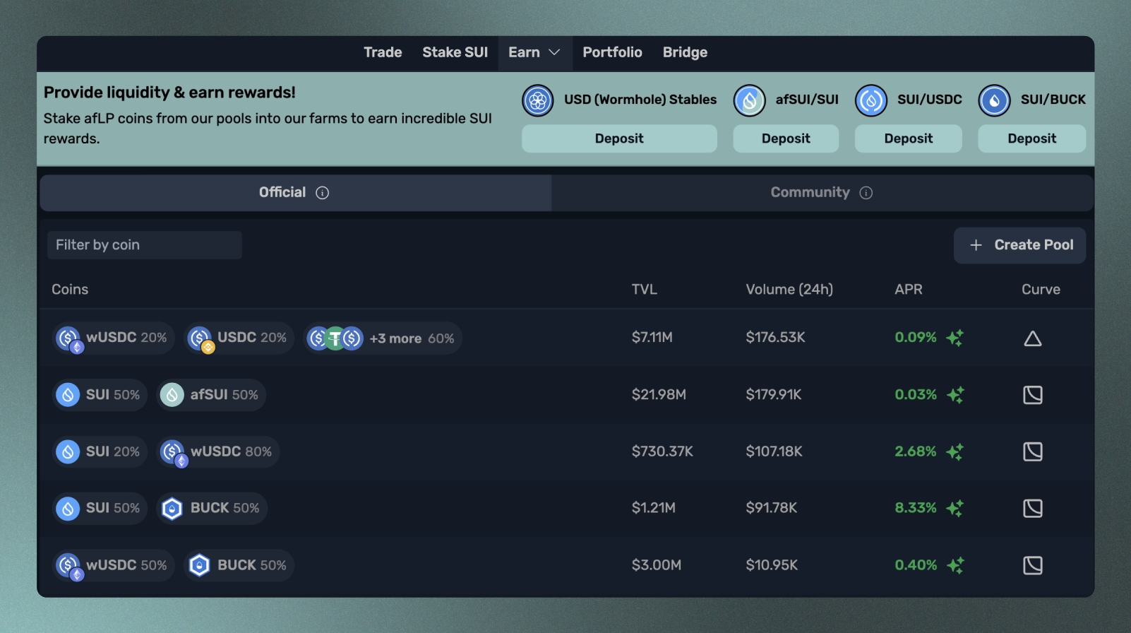 最初,这些代币池发射 SUI 和 afSUI 代币,但将来也会发射其他代币。 代币排放分配每分钟计算一次,每个流动性提供者根据其在农场中的流动性总量与农场中的总流动性总量之比,获得相应份额的奖励。 要入股 Afterburner Vault,首先您必须向其中一个符合条件的资金池提供流动资金。有关如何操作的说明,请参阅我们有关向资金池注入资金的文档。