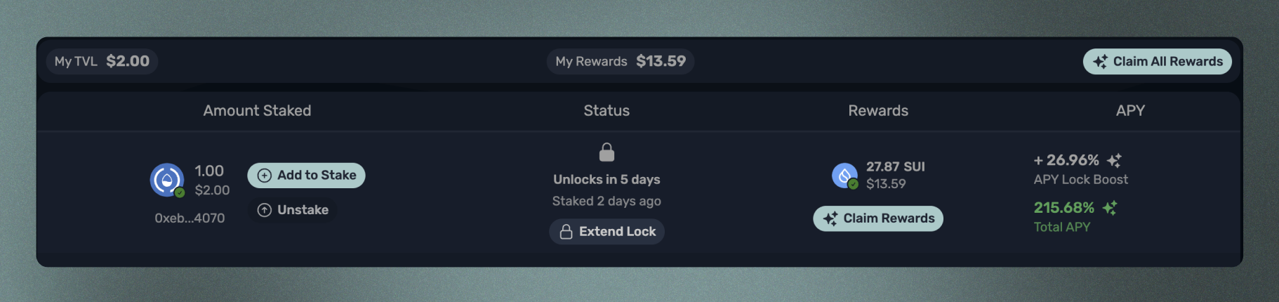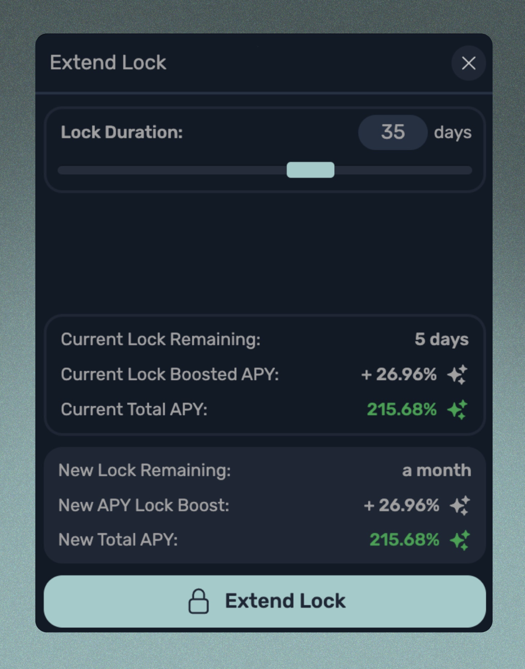 通过延长锁定,您可以通过将之前抵押的LP代币锁定更长时间来赚取额外奖励。如果选择此选项,您将能够在执行交易之前查看质押位置的变化,包括查看新的APY和新的剩余锁定时间。