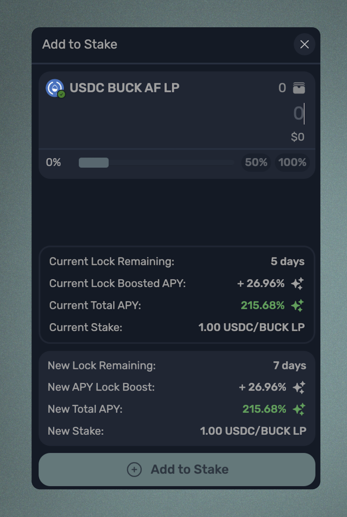 添加质押允许您增加已承诺给农场的LP代币数量。如果选择此选项,您将能够在执行操作之前查看这将对您的位置造成的更改。可以查看指标,如新锁定剩余、新APY锁定提升和总APY以及质押金额。