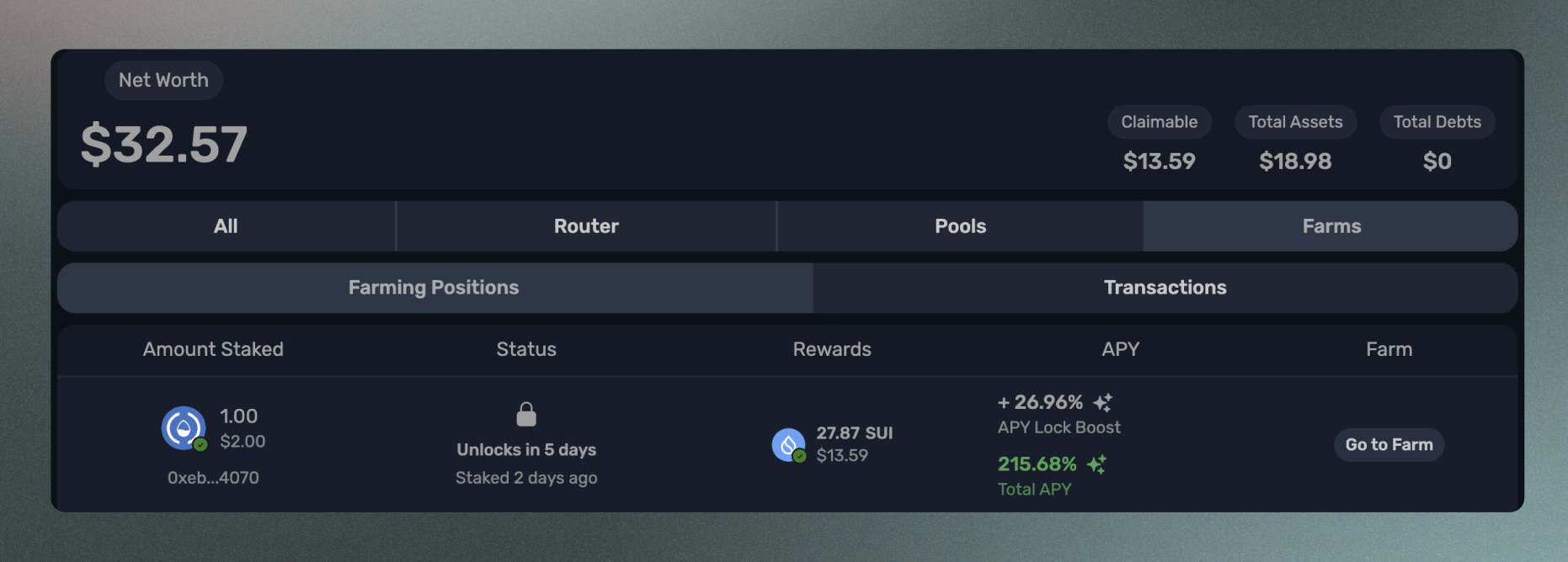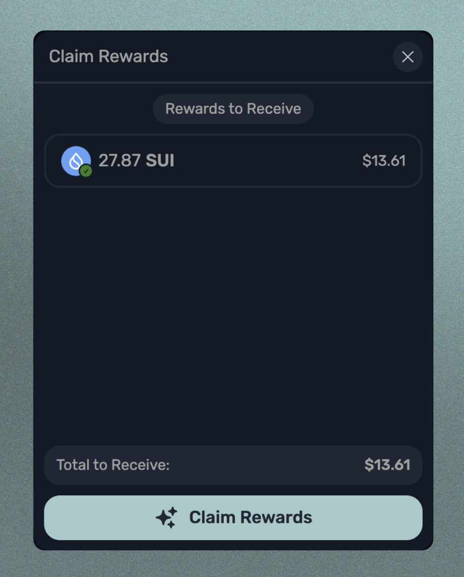 我们的保险库利用了Sui固有的所有权语义。当您将资产(例如我们afSUI/SUI LP)质押到我们其中一个保险库中时,您创建了一个包装了您所抵押代币的仓位。由于保险库无法与您所拥有且仅属于您自己的抵押仓位进行交互 - 包括向您的仓位分发奖励,因此只有在签署一笔交易以与您的仓位进行交互后才会更新你仓位上面额外获得收益。 我们已经设置好这样做,以便任何操作都可以更新你仓位上面额外获得收益,并不仅限于索赔奖励行为。