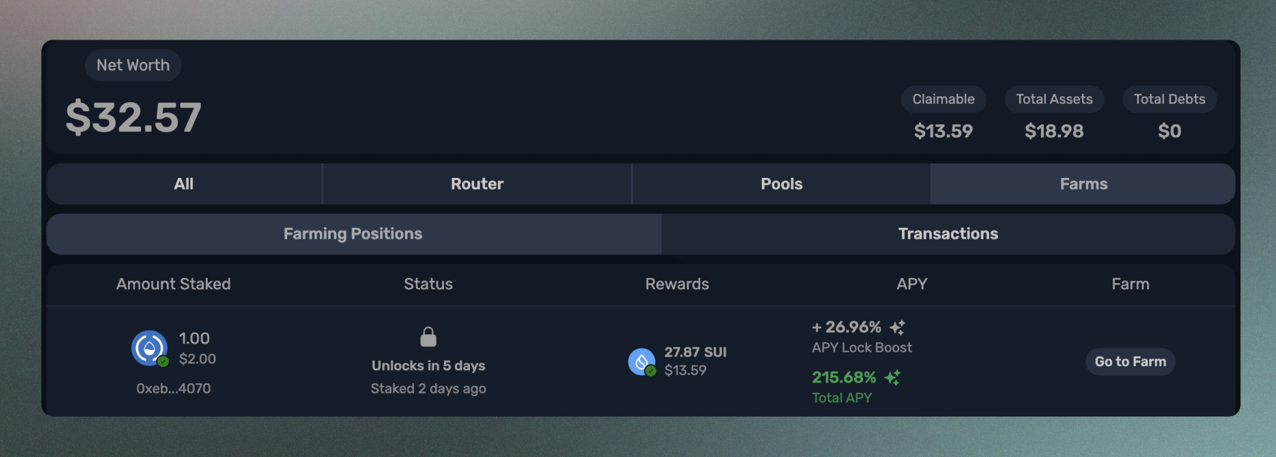 一旦您将资金存入Afterburner Vault,您就可以监控您的仓位状态并执行各种操作。如果您已经在多个农场中抵押了资金,您可以导航到“投资组合”选项卡,选择“农场”选项卡,并轻松查看所有的农场仓位并转到它们各自的页面。有关更多信息,请参阅文档中的“查看投资组合:农场”部分。